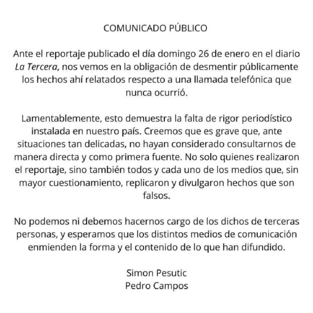 La tarde de este lunes, Pedro Campos y Simón Pesutic emitieron un comunicado conjunto para referirse a la polémica que desató un reportaje del diario La Tercera .