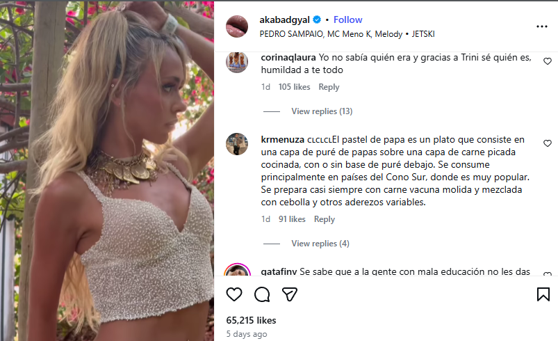 Tal fue la indignación del momento que la influencer etiquetó directamente a Bad Gyal y agregó un emoji con el pulgar hacia abajo, para desaprobar el gesto que tuvo hacia ella.