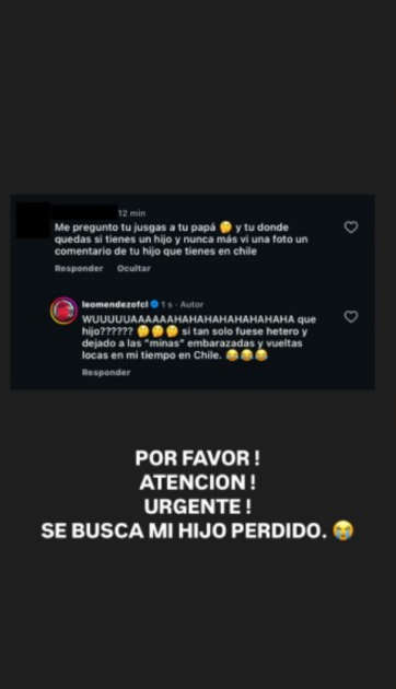 Leo Méndez Jr. se tomó la inesperada acusación con humor: “¿Qué hijo? Si tan solo fuese hetero y dejado a las ‘minas’ embarazadas y vueltas locas en mi tiempo en Chile”.