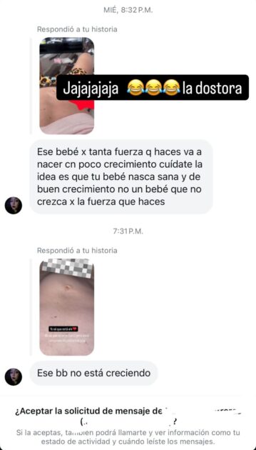 “Ese bebé por tanta fuerza que haces va a nacer con poco crecimiento, cuídate. La idea es que tu bebé nazca sana y no una guagua que no crezca”, le dijo una cibernauta.