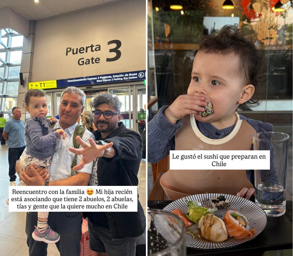 “Reencuentro con la familia. Mi hija recién está asociando que tiene 2 abuelos, 2 abuelas, tías y gente que la quiere mucho en Chile“, reconoció Arenita en una publicación que subió a sus historias de Instagram.