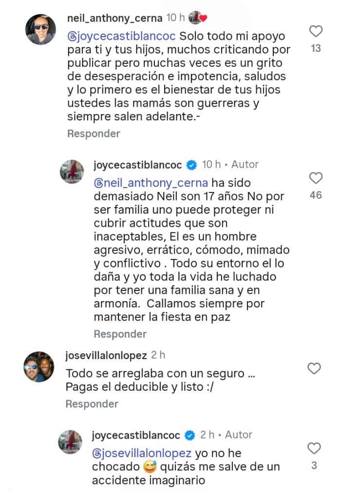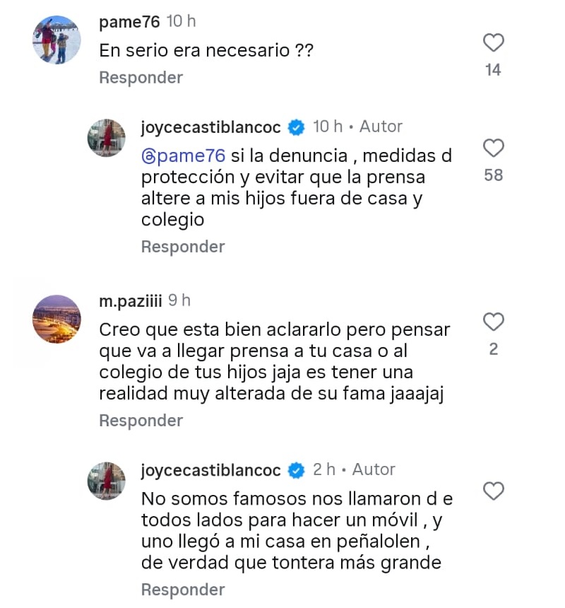 Además, la propia Joyce fue revelando nuevos detalles del conflicto con su cuñado, a medida que respondió distintos comentarios que le dejaron en su publicación.