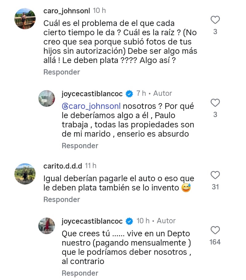En otro mensaje, Joyce insistió en que no tenían ninguna deuda con Óscar Garcés: “Paulo trabaja; todas las propiedades son de mi marido. En serio, es absurdo”.