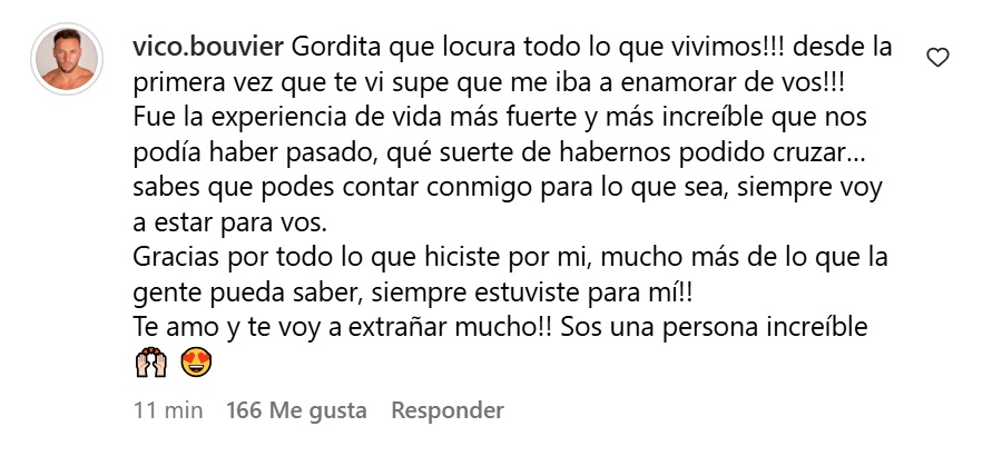 “Qué locura todo lo que vivimos. Desde la primera vez que te vi, supe que me iba a enamorar de vos. Fue la experiencia de vida más fuerte y más increíble que nos podía haber pasado”, escribió en la caja de comentarios.