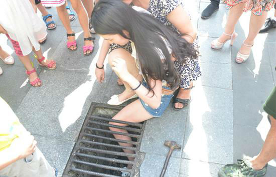 Mientras caminaba, la menuda fémina no se fijó donde pisó, y su pierna pasó directo por entre los barrotes de una alcantarilla. Con su extremidad completamente apretada, los esfuerzos de los transeúntes por ayudarla fueron en vano.