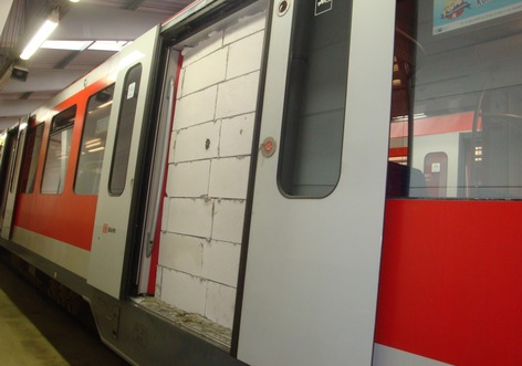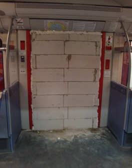 Bromistas construyen una pared de ladrillos en puerta de un vagón de metro