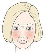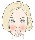 Características: Granos alrededor de la barbilla, mejillas algo rojas e hinchadas y parches oscuros.