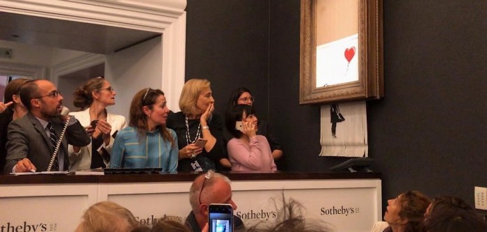 Sotheby’s, una de las casas de remates más antiguas e importantes del mundo, estaba subastando varios lotes de arte contemporáneo, entre los que se encontraba una reproducción en pintura acrílica y aerosol de una de las imágenes más famosas de Banksy, Girl with Balloon, una niña que deja volar un globo rojo con forma de corazón.