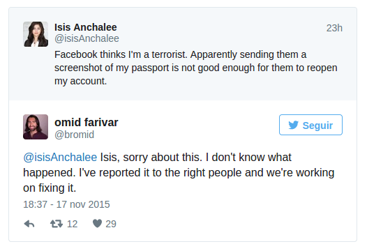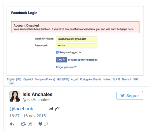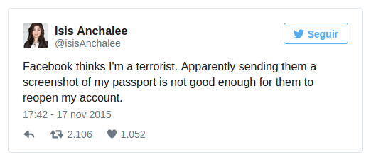 Al parecer Facebook bloqueó su cuenta debido a que su nombre, Isis, coincidía con las siglas del Estado Islámico. Esta situación la compartió a través de su cuenta de Twitter, y debido a su popularidad rápidamente se viralizó en la red, consignó el portal argentino La Nación.