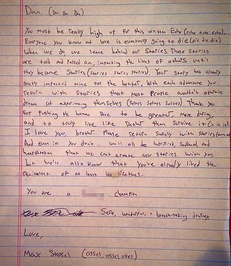Debes estar muy alto para estar leyendo este eco (eco, eco, eco) escrito. Todas las personas que conocemos y amamos finalmente van a morir (morir morir morir). Cuando lo hacen, dejan atrás sus historias. Esas historias se cuentan y se transmiten, impactan en las vidas de los demás hasta que son historia (historia historia historia). Tu historia ya ha impactado enormemente en la mía, para bien. Con cada aventura regresas con historias que la mayoría de la gente no soñaría experimentar por ellos mismos (mismos mismos mismos). Gracias por empujar a la raza humana a que sea más grande, más atrevida, y vivir la vida de verdad en vez de sobrevivir en ella (ella ella ella). Te quiero, hermano. Por favor regresa con historias (historias historias). E incluso si no lo haces… Todos estaremos horrorizados, entristecidos y con el corazón roto por no poder crear nuevas historias contigo, pero también vamos a saber que ya has vivido el equivalente de al menos 100 vidas.