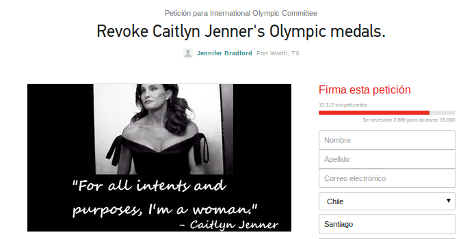“Recientemente se supo que el campeón olímpico Bruce Jenner es transgénero y se presenta como una mujer. Felicitamos a Jenner y le deseamos lo mejor. Pero esto crea un problema porque Jenner afirma que siempre se ha sentido una mujer“, señala el texto de la petición dirigida al Comité Olímpico Internacional (CIO) por su creadora.