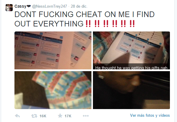 Hoy es el turno de una mujer estadounidense llamada Cassy, quien parece tener las habilidades de un detective, ya que logró meterse a la cuenta de Twitter de su novio para revisar sus mensajes privados, descubriendo que le ponía los cuernos con otra.