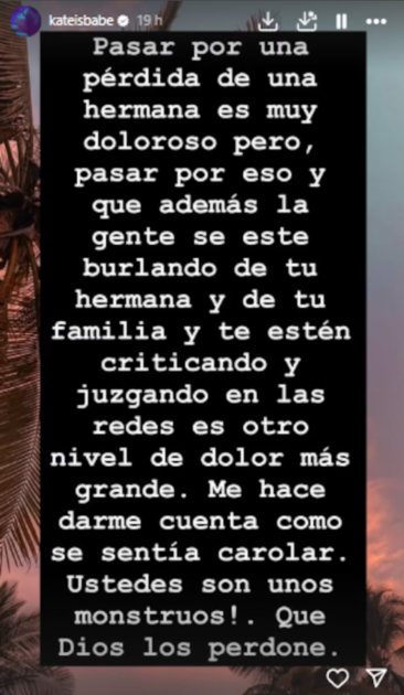 “Pasar por una pérdida de una hermana es muy doloroso, pero pasar por eso y que además la gente se esté burlando de tu hermana y de tu familia y te estén criticando y juzgando en las redes, es otro nivel de dolor”, escribió.