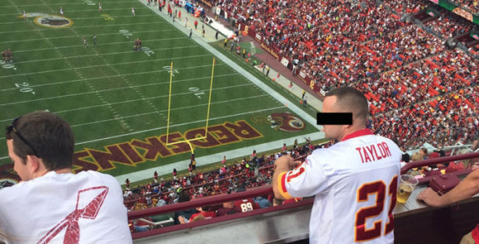 La escandalosa pareja fue fotografiada durante el juego de los Redskins, y en las imágenes se puede ver a un sujeto en las graderías, viendo el partido, mientras una mujer estaba sentada en el suelo con su cara entre las piernas del hombre, practicándole, aparentemente, sexo oral.