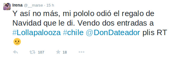 La usuaria @__Marse, que aparece en esa red con el nombre Irena, publicó la tarde de ayer un tuit donde señalaba que había regalado a su pololo una entrada para el popular festival de música Lollapalooza, presente que el hombre habría rechazado.