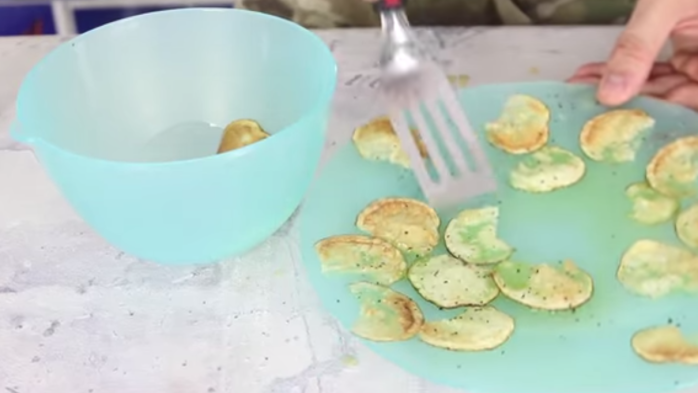 Engrasa un plato con aceite de oliva y reparte las rodajas sobre el, agrega sal y algún otro aliño que desees (pimienta, merkén, orégano, etc.)