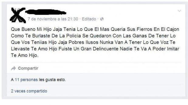“Que Bueno Mi Hijo Jaja Tenia Lo Que El Mas Queria Sus Fierros En El Cajon Como Te Burlaste De La Policia Se Quedaron Con Las Ganas De Tener Lo Que Vos Teniias Hijo Jaja Pobres Ilusos Nunka Van A Tener Lo Que Voz Te Llevaste Te Amo Hijo Fuiste Un Gran Delincuente Nadie Te Va A Poder Imitar Te Amo Hijo (sic)”.