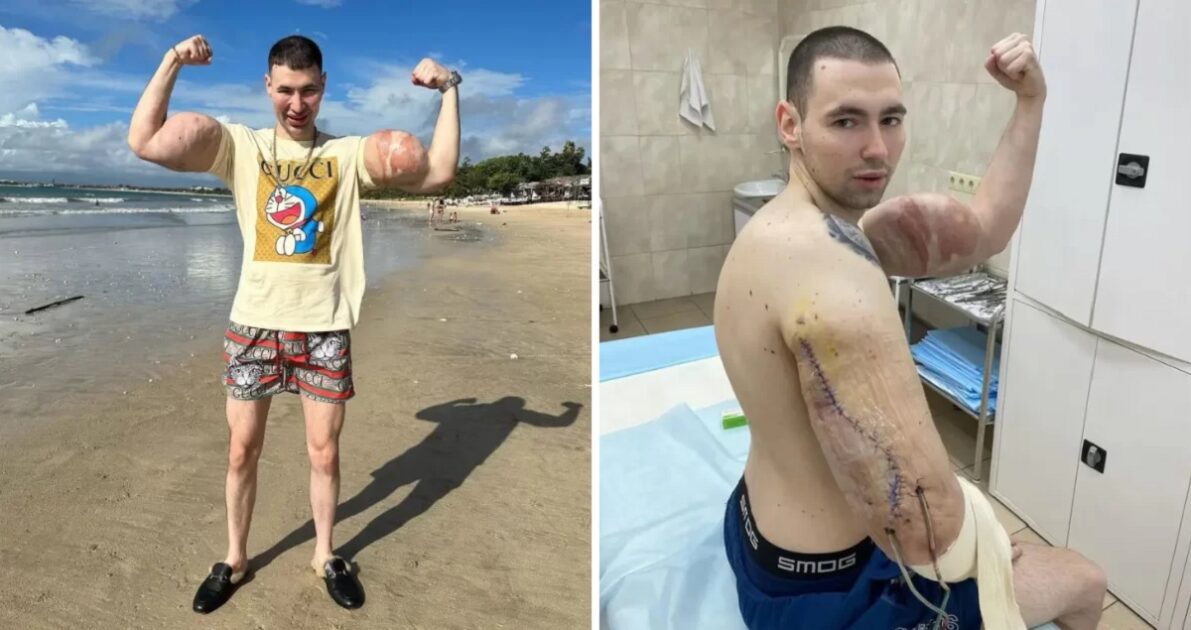La situación quedó aún más clara cuando Tereshin compartió imágenes que alarmaron a sus seguidores: sus bíceps se habían “reventado”, dejando un agujero profundo con tejido deteriorado.