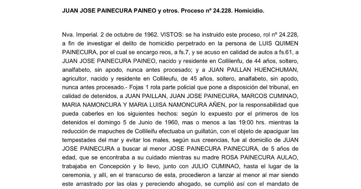 El proceso judicial determinó que los involucrados “actuaron sin libre voluntad, impulsados por una fuerza física irresistible, de usanza ancestral”. La machi fue absuelta y dos años después, todos los acusados quedaron libres.