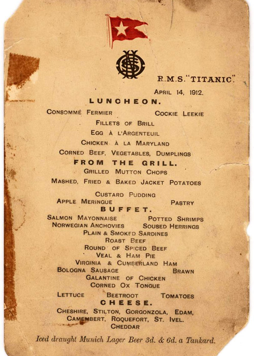 Desde carne de albóndigas, filetes de rodaballo, chuletas de cordero a la parrilla, puré y papas asadas al horno, salmón, anchoas noruegas y distintas variedades de queso y otras sustancias, es lo que se puede apreciar en el menú, que tiene como fecha el 14 de abril de 1912 fecha en la que el barco se hundió. Según como lo detalla La Tercera, la subasta busca reunir unos 50 a 70 mil dólares, más de 40 millones de pesos.