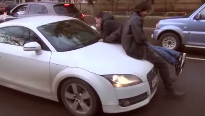 Sobre un lujo Audi modelo TT, esta enfurecida fémina fue recriminada por un grupo de activistas del grupo Stopham, que andan a la caza de conductores que no respetan las normas de tránsito en las calles rusas, según acota el portal automotriz de diario Publimetro, Tacómetro.