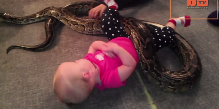 Critican a padre gringo por dejar que su bebé juegue con una pitón domesticada