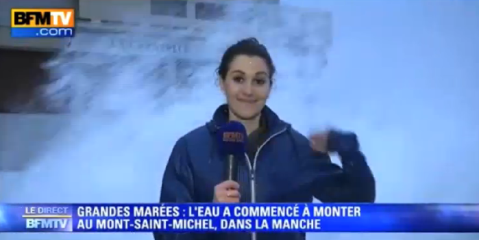 Mientras realizaba un despacho en directo desde el Monte Saint-Michel en Francia, la mujer del tiempo, Fanny Agostini, entregaba antecedentes sobre las fuertes marejadas que acechaban a esa localidad.