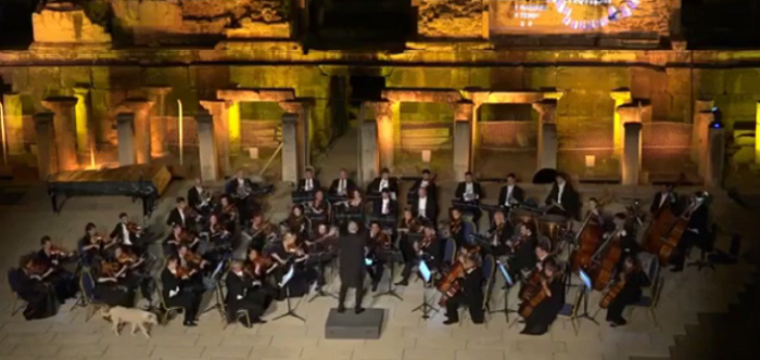 La escena tuvo lugar la semana pasada cerca de Esmira, en el oeste de Turquía. Mientras la Orquesta de Cámara de Viena dirigida por el sueco Ola Rudner toca la cuarta sinfonía de Mendelssohn, el perro sube al escenario, aparentemente atraído por la música.