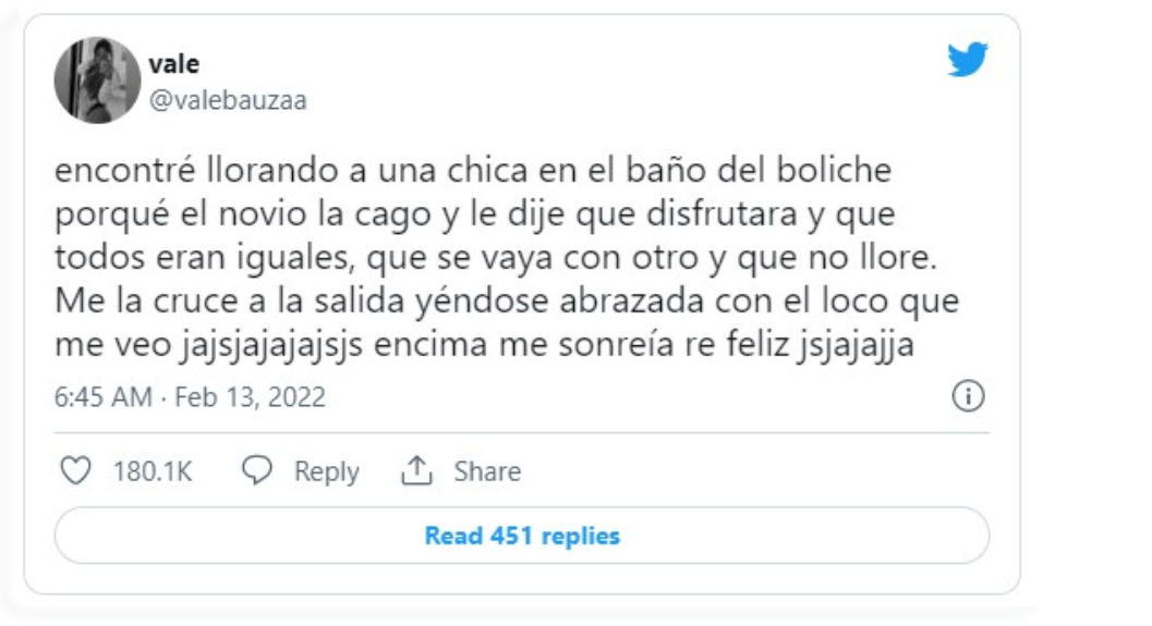 El pasado fin de semana, una tragicómica historia se hizo viral en Twitter, donde la usuaria @valebauzaa contó que había aconsejado a una joven que conoció en el baño de la discoteca porque su novio la había engañado.