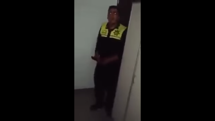 Mientras el policía intentaba tapar su rostro, la joven estaba sentada y semidesnuda en el lavamanos del recinto, para luego bajar de ahí y ponerse una falda de jeans, mientras su rostro no daba más de la vergüenza.