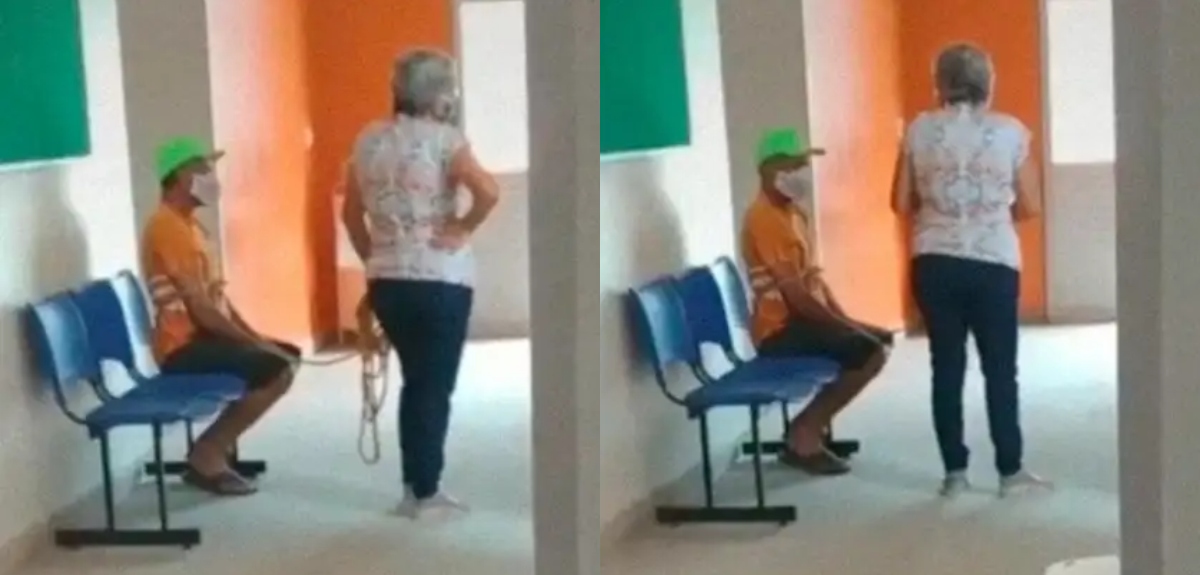 A lo largo de los 17 segundos de video, se puede ver al marido de la mujer con la mascarilla puesta, y amarrado con una cuerda que rodea sus brazos y le impide escaparse. Mientras tanto, su esposa está de pie y sujeta la soga entre sus manos.