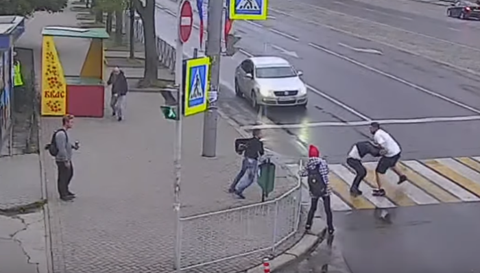 En Rusia se vivió un complejo momento luego que unas cámaras de seguridad captaran una pelea en plena vía pública. Lo anterior, luego de que unos transeúntes hicieran respetar un cruce peatonal mientras transitaban por la calle.